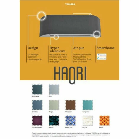 C’est parfaitement possible avec le modèle mural Haori de TOSHIBA. Un climatiseur design, doté d’un magnifique habillage en tissu. La housse en tissu est facilement interchangeable : vous pouvez, par exemple, changer de couleur ou même imaginer une création personnelle ! Mais le modèle Haori a bien plus à offrir que son esthétique : air pur, possibilités de commande diverses et techniques de soufflage optimisées, pour un confort optimal.
